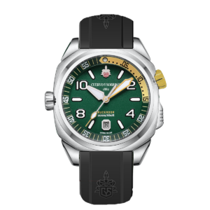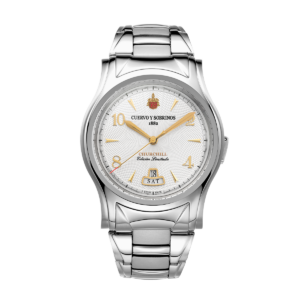 Stainless steel, diameter 44 mm, height 12.10 mm, double curved sapphire crystal with anti-reflective coating, water resistant to 3 ATM, crown with CyS emblem engraving, screwed-down lugs, engraved Emilio Carranza case back