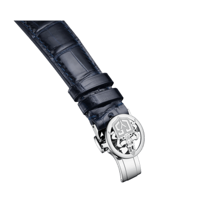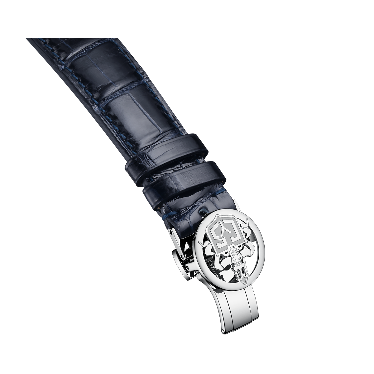 Blue guilloché dial, gold colored applied indices, applied CyS emblem