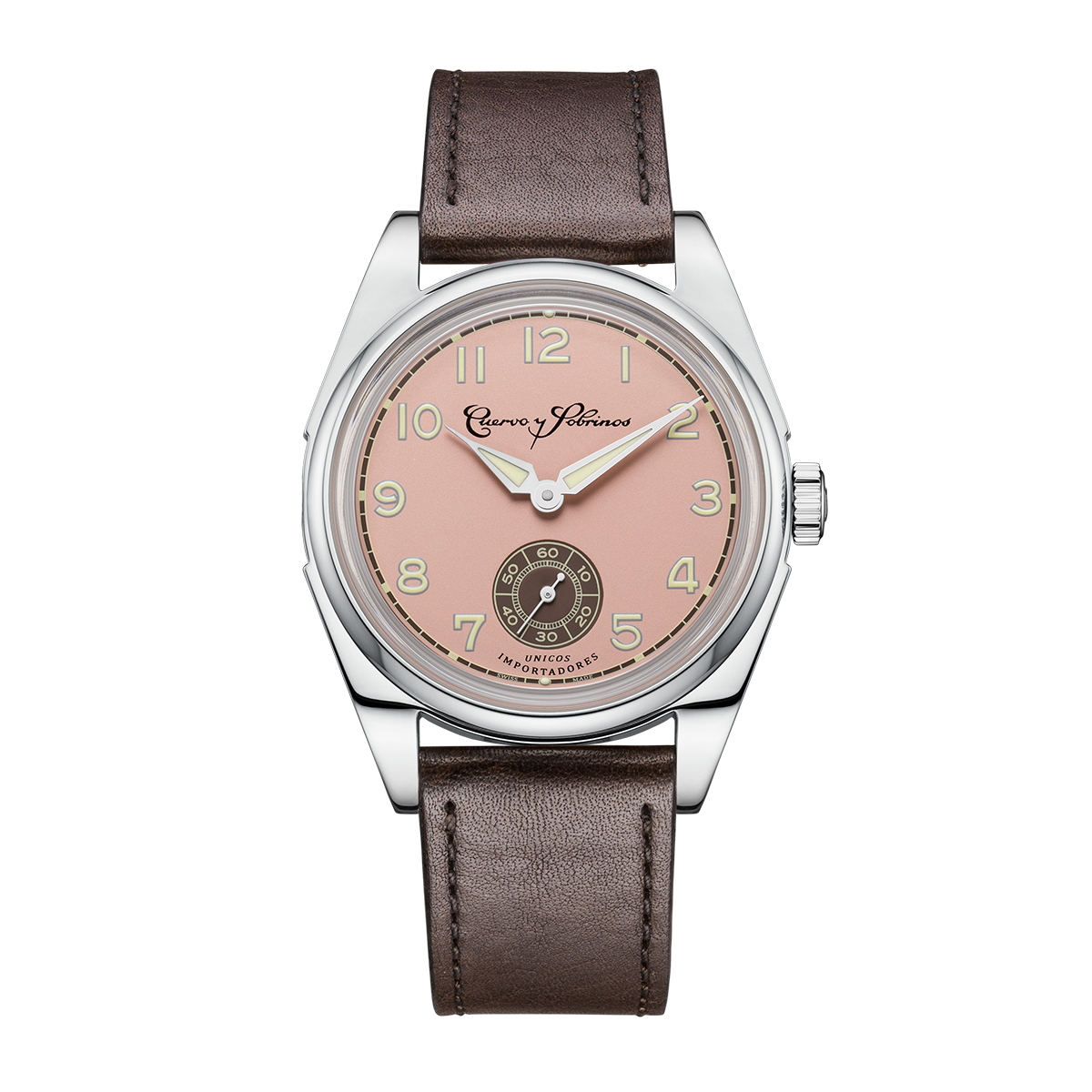 Salmon dial, applied indices filled with Super-LumiNova®