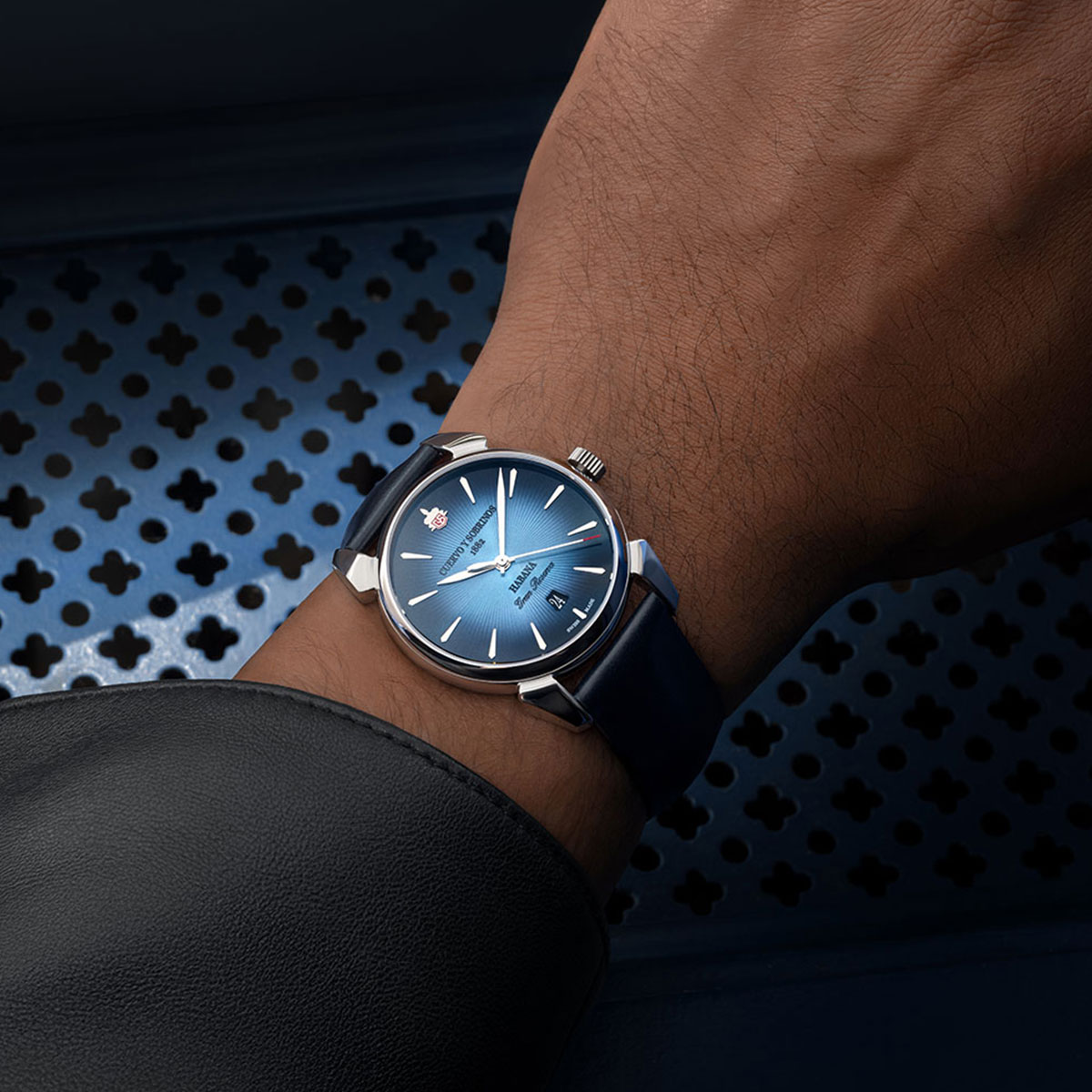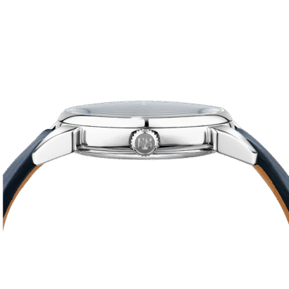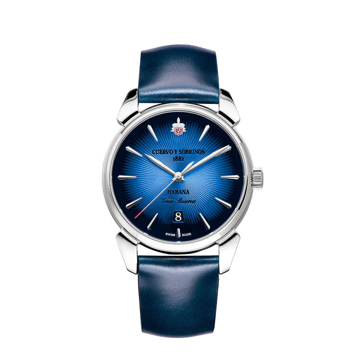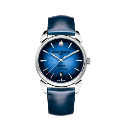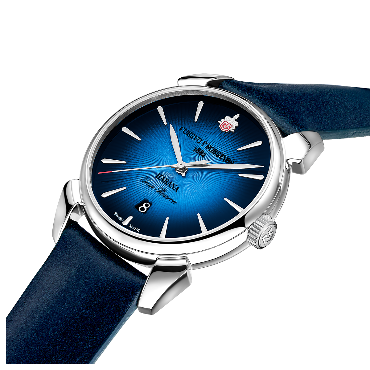 Guillochè blue smoked sunray dial laquered. The date features white numerals on a black disc. An applied CyS emblem is positoned at 12 o’clock