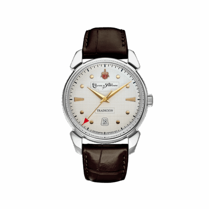 Silver. A finely decorated dial with grid-shaped ‘frappage’, inspired by the original dial motif employed on the former 1950s model’. ‘Cuervo y Sobrinos’ and ‘Tradicion’ vintage style ‘cartouche, date indication. Gold colored applied trapezoidal and circular indices. Gold colored applied CyS emblem with red accents