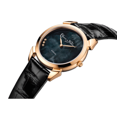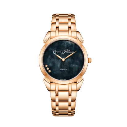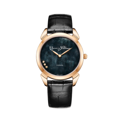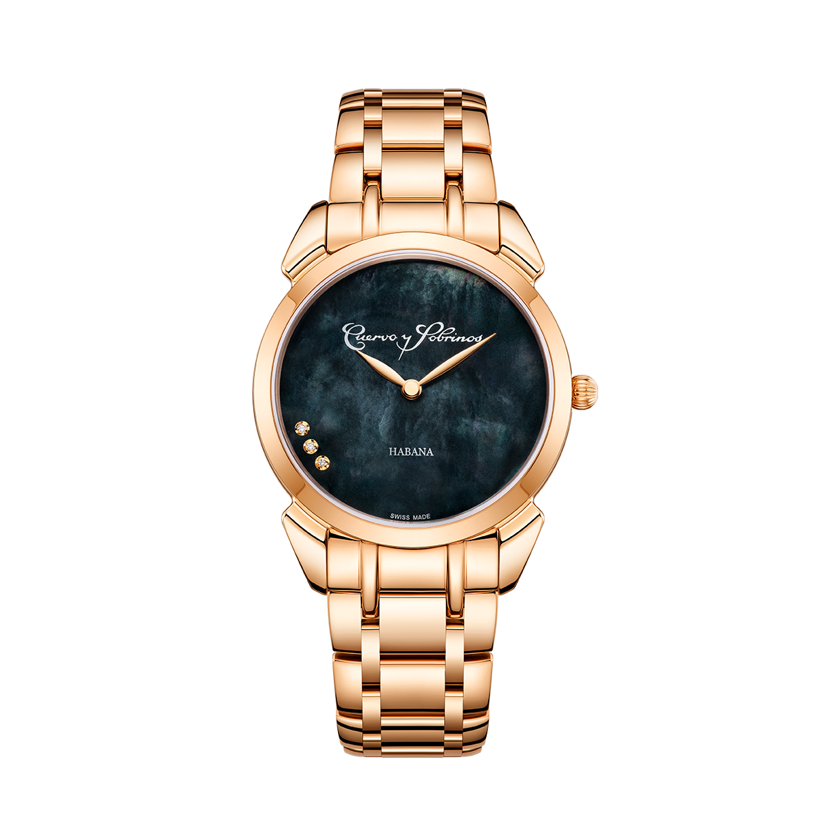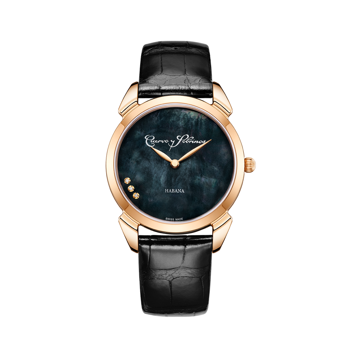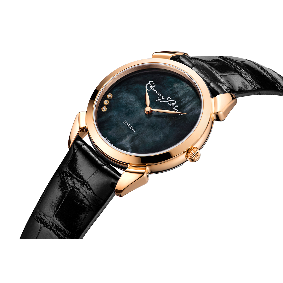 Black colored mother of pearl with three diamonds, vvs, 0,018 carats, applied indices, applied CyS emblem