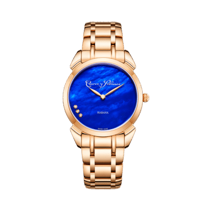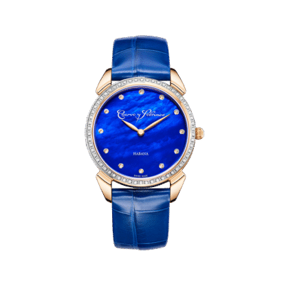 Did you know the Primera Dama draws inspiration from the glamorous 1930s Havana, a time when the city was a hub of luxury, music, and dance? This elegant timepiece features a 36mm stainless steel case and a mother-of-pearl dial adorned with diamonds, adding a touch of sophistication. The watch is available with a glossy Louisiana alligator strap and a matching stainless steel bracelet.