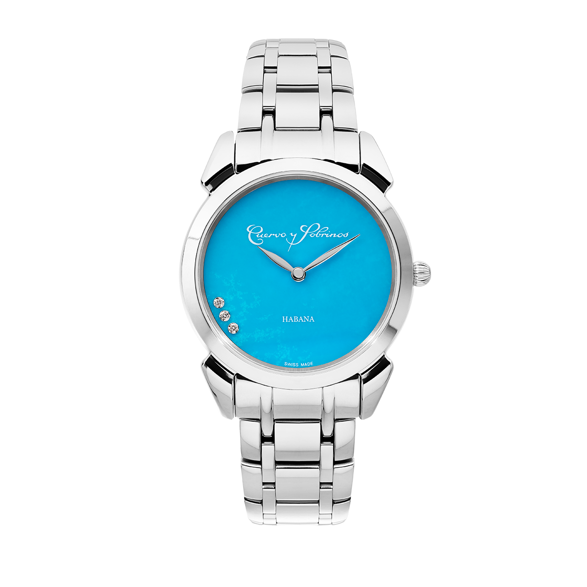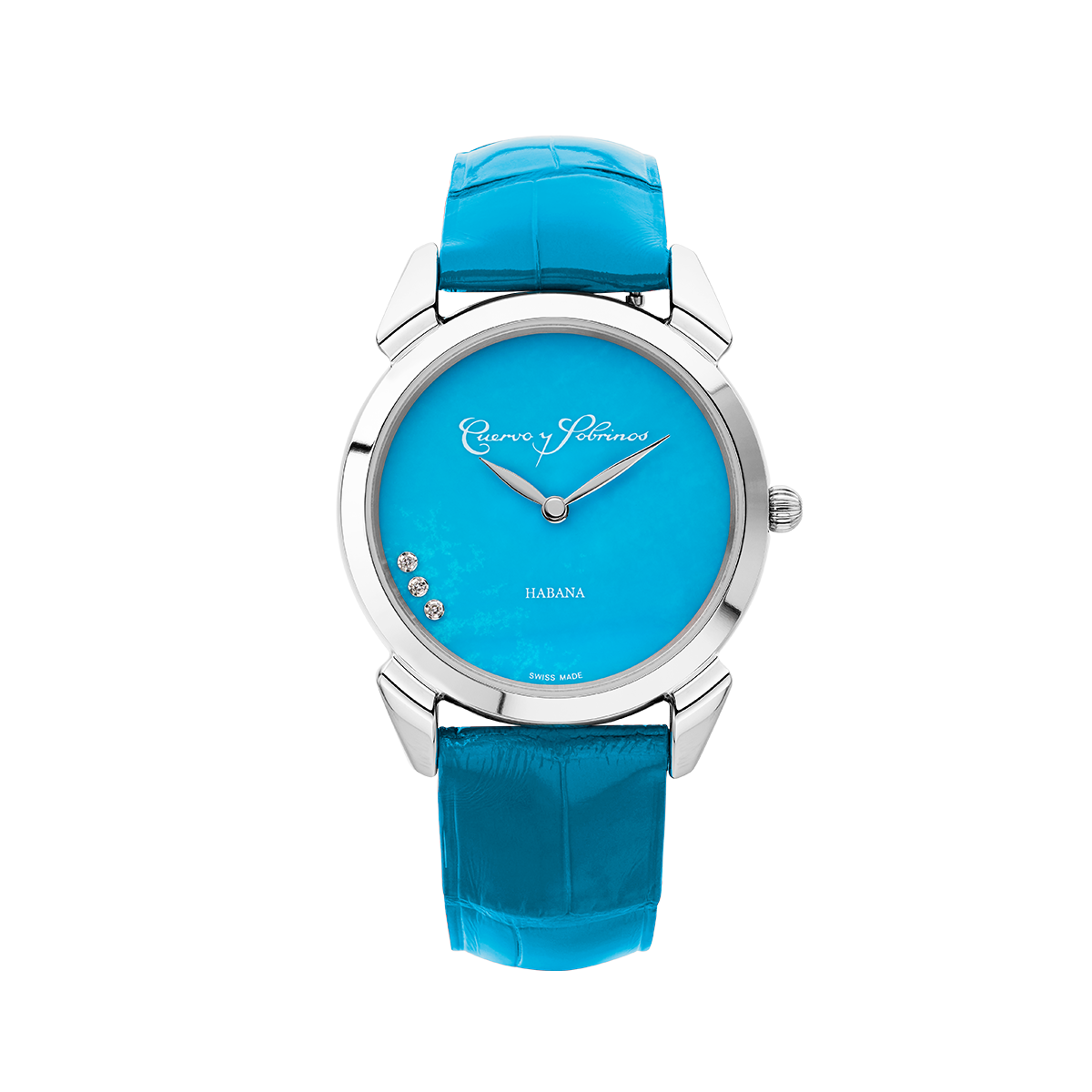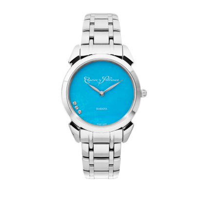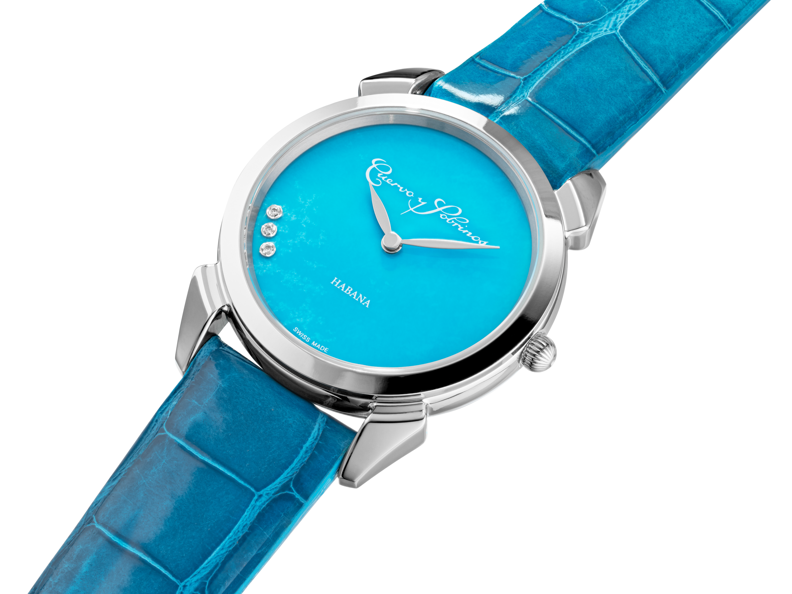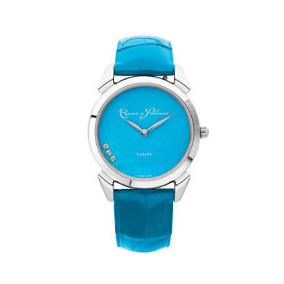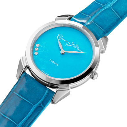 Did you know the Primera Dama draws inspiration from the glamorous 1930s Havana, a time when the city was a hub of luxury, music, and dance? This elegant timepiece features a 36mm stainless steel case and a mother-of-pearl dial adorned with diamonds, adding a touch of sophistication. The watch is available with a glossy Louisiana alligator strap and a matching stainless steel bracelet.