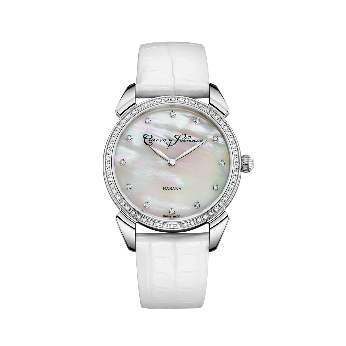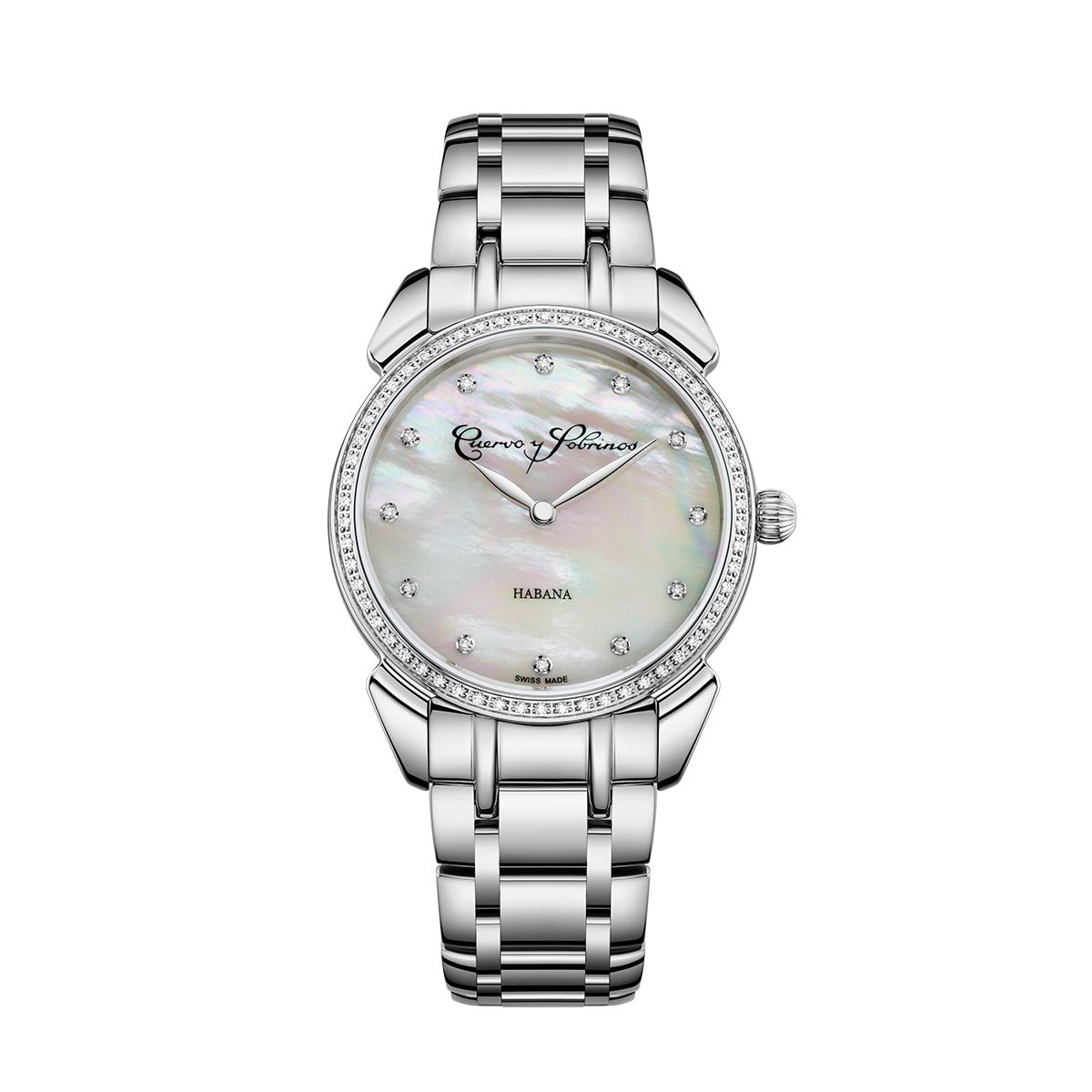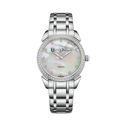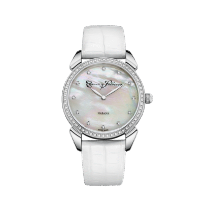Did you know the Primera Dama draws inspiration from the glamorous 1930s Havana, a time when the city was a hub of luxury, music, and dance? This elegant timepiece features a 36mm stainless steel case and a mother-of-pearl dial adorned with diamonds, adding a touch of sophistication. The watch is available with a glossy Louisiana alligator strap and a matching stainless steel bracelet.